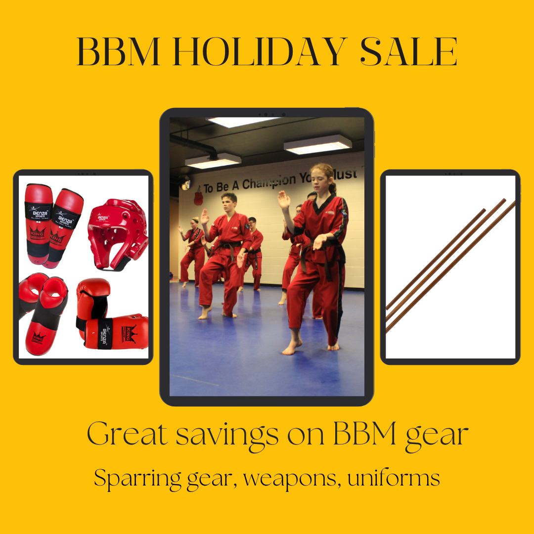 Are you in need of sparring equipment? Have you grown out of your current bo staff or uniform? Take advantage of our BBM Holiday Sale next week. Tuesday November 8th and Wednesday November 9th, sparring equipment, bo staffs, and uniforms will all be on sale. 20% off equipment and 25% off uniforms. Mark your calendars and plan on dropping in …