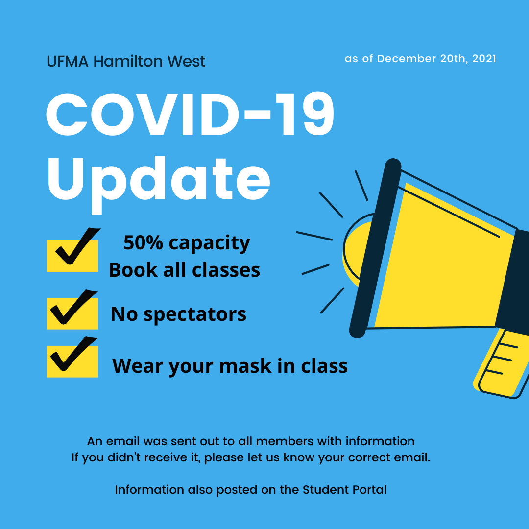 We really hoped we wouldn’t have to go this route, however, with the Omicron variant and rising numbers, we have implemented some changes for classes. The school has a 50% capacity limit, therefore it is extremely important that students sign up for every class using the Booking System. Unfortunately, we can no longer have spectators watching class (exception- one parent/guardian …